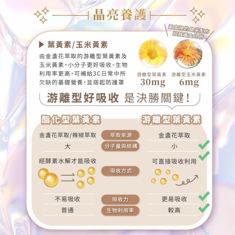 ✦ 游離型金盞花葉黃素+玉米黃素-經美國國家衛生研究院人體臨床實驗證實,提供最佳保護力