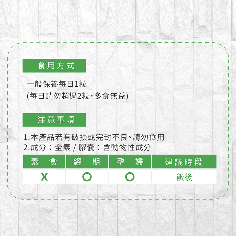 一般保養每日1粒(每日請勿超過2粒,多食無益)
