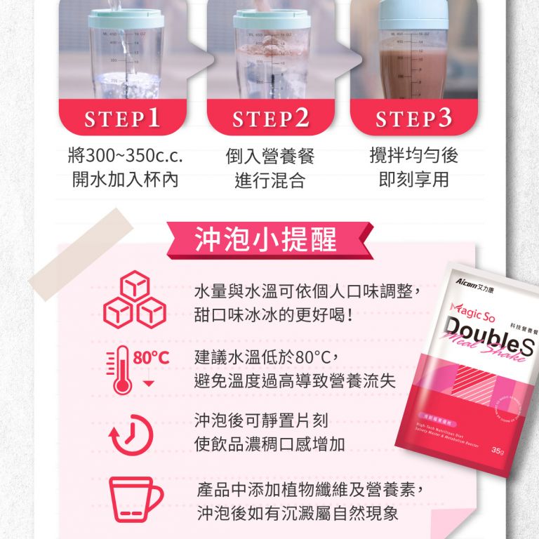 ✔沖泡300 ~ 350 c.c. 常溫水,並充份攪拌後即可飲用 (水溫勿超過80°C,並可依個人口味調整水量)