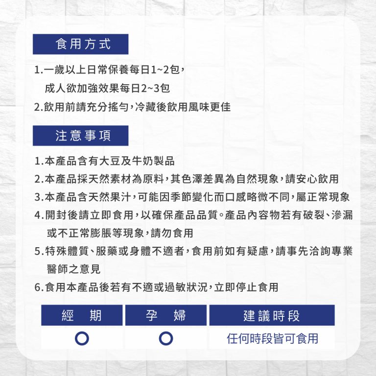 液態(25ml/7包入)*2盒,每日1次,每次1~2包,飲用前請充分搖勻,冷藏後飲用風味更佳